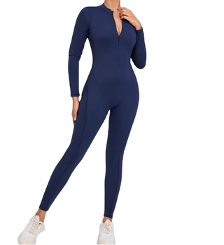 بدلة رياضية مخصصة للنساء بظهر حرف V بدلة رياضية قطعة واحدة بذلة يوغا مع عارية الظهر بأكمام طويلة من الأمام بدلة تدريب رياضية بسحاب أمامي